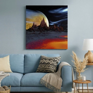 Bild auf Leinwand - Leinwandbild - Eine fantastische Landschaft mit Planeten und Vulkanen - 100x70cm - Unbekannte Welt - Moderne Wanddekoration für Wohnzimmer und Schlafzimmer ARTTOR
