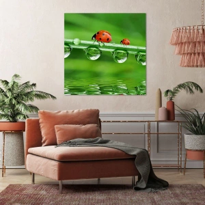 Diese Komposition schmückt nicht nur, sondern beruhigt und inspiriert auch. Sie ist die perfekte Wahl für alle, die den Kontakt mit der Natur und subtile dekorative Akzente schätzen. Ein Druck mit Marienkäfern vor einem Hintergrund aus Tautropfen ist auch eine tolle Geschenkidee für Liebhaber der Natur und einzigartiger Details in der Inneneinrichtung.