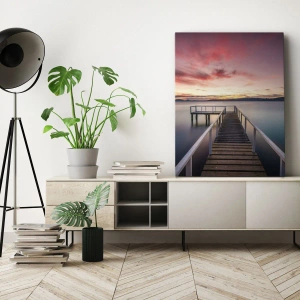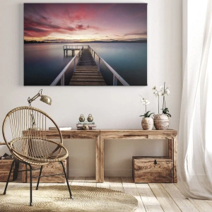 - Dieses bezaubernde Leinwandgemälde im Format 70 x 50 cm zeigt einen Steg, der zu einem ruhigen See bei Sonnenuntergang führt. Es eignet sich perfekt für Innenräume und bringt Harmonie und Ruhe.
