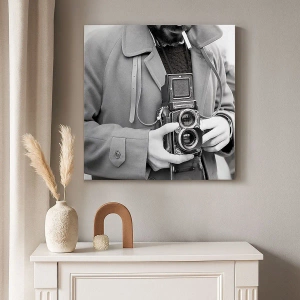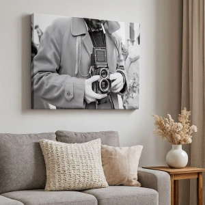 • Das Gemälde zeigt einen Mann mit einer Retro-Kamera in Schwarzweiß und vermittelt ein nostalgisches Vintage-Gefühl. Es ist die perfekte Wahl für klassische oder minimalistische Innenräume.