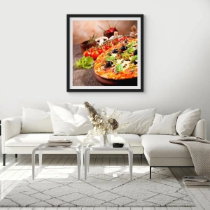Poster in einem schwarzem Rahmen - Pizza mit Oliven und Kräutern mit frischen Zutaten - 50x70cm - Aus den tellurischen Zutaten - Moderne Wanddekoration für Wohnzimmer und Schlafzimmer ARTTOR