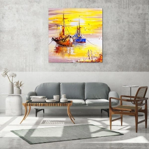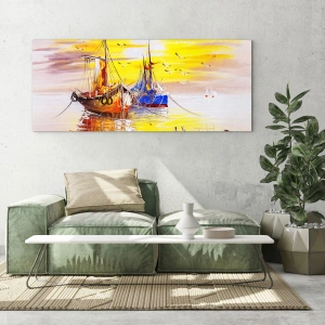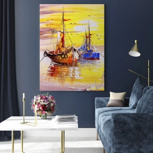 Glasbild - Bild auf glas - Fischerboote bei Sonnenuntergang auf ruhigem Wasser - 50x70cm - Eine wohlverdiente Pause im Hafen - Moderne Wanddekoration für Wohnzimmer und Schlafzimmer ARTTOR