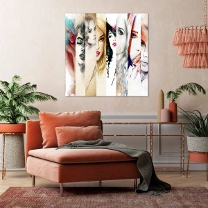 - Dieses Gemälde zeigt eine Reihe von Frauenporträts, die in verschiedenen künstlerischen Stilen ausgeführt wurden. Die Vielfalt der Farben und Techniken macht es zu einer einzigartigen Ergänzung für jedes Interieur.