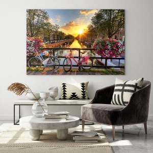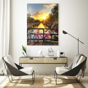 - Ein Sonnenuntergang über einem Amsterdamer Kanal, mit Fahrrädern und wunderschönen Blumen im Hintergrund. Eine perfekte Dekoration für Innenräume, die von Stadt, Natur und Ruhe inspiriert sind.