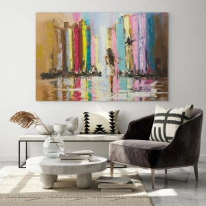 Pastelltöne in Rosa, Gelb, Blau und anderen Gebäudefarben erzeugen eine stimmige, energiegeladene Komposition. Das Motiv der Spiegelungen im Wasser verleiht dem Bild Tiefe und eine zusätzliche künstlerische Dimension. Der einzigartige abstrakte Stil lässt die Szene Aufmerksamkeit erregen und inspiriert durch ihre Einzigartigkeit.