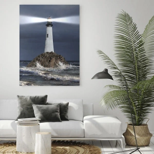 - Das Gemälde zeigt einen einsamen Leuchtturm auf einem Felsen inmitten stürmischer See. Sein starkes Licht erhellt den Nachthimmel und bildet einen Kontrast zum dunklen Himmel und den Wellen, die gegen die Felsen schlagen.