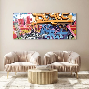 Das Graffiti-Motiv ist Ausdruck von Freiheit, Kreativität und urbanem Stil. Es ist ein Symbol modernen künstlerischen Ausdrucks, das inspiriert und die Individualität eines Raumes betont. Intensive Farben und eine komplexe Komposition machen dieses Gemälde auffällig und anregend.