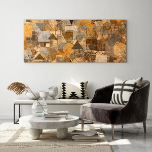 Tauchen Sie mit diesem einzigartigen Glasbild in die Welt der geometrischen Harmonie ein. Es zeigt eine abstrakte Komposition geometrischer Figuren in warmen Braun- und Gelbtönen, die dem Interieur Wärme und einen modernen Stil verleihen. Es ist die perfekte Wahl für Liebhaber von Minimalismus und zeitgenössischer Kunst.