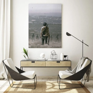 - Das 70x50 cm große Glasbild zeigt eine einsame Gestalt mit einem Gewehr in dunkler Umgebung, perfekt als Dekoration für Liebhaber dramatischer Motive.