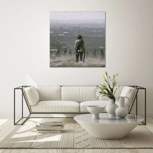 Glasbild - Bild auf glas - Eine Figur mit einem Gewehr in der dunklen Szenerie einer sich nähernden Gruppe - 70x50cm - Letzter Gerechter? - Moderne Wanddekoration für Wohnzimmer und Schlafzimmer ARTTOR