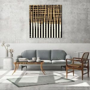 Die Verwendung von Gold und Schwarz verleiht dem Bild Eleganz und Luxus. Goldakzente auf mattschwarzem Hintergrund ziehen die Aufmerksamkeit auf sich und verleihen der Komposition einen exklusiven Charakter. Der Effekt von Abrieb und Unregelmäßigkeit verleiht dem Bild trotz seiner geometrischen Ordnung künstlerische Unordnung und Tiefe. Diese Kombination aus Struktur und Ausdruck macht das Bild zu einem außergewöhnlich faszinierenden Dekorationselement. Goldtöne verleihen Wärme und Noblesse und gleichen die kühle geometrische Struktur aus. Die unauffällige Kombination aus horizontalen und vertikalen Strukturen erzeugt eine faszinierende visuelle Spannung, die den Blick stets auf sich zieht. Abrieb und unregelmäßige Linien sorgen für Unvollkommenheit und machen das Bild menschlicher, emotionaler und dynamischer.