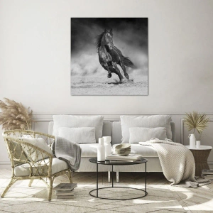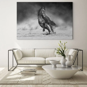 Glasbild - Bild auf glas - Ein schwarzes Pferd, das in Schwarz und Weiß über den Sand galoppiert. - 70x50cm - Würdig des Emirs selbst - Moderne Wanddekoration für Wohnzimmer und Schlafzimmer ARTTOR
