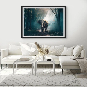 - Ein Poster, das einen Elefanten in einem dichten, vom Sonnenlicht beleuchteten Wald zeigt und dem Innenraum eine exotische Atmosphäre und Harmonie verleiht.