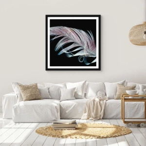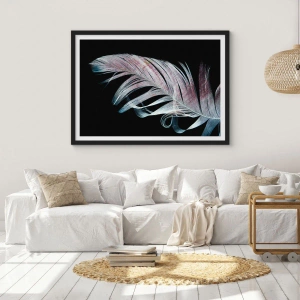 Poster in einem schwarzem Rahmen - Eine zarte Feder auf schwarzem Hintergrund in einem künstlerischen Ansatz - 70x50cm - Denke an Berührung - Moderne Wanddekoration für Wohnzimmer und Schlafzimmer ARTTOR