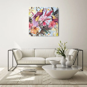 Wanduhr - Glasuhr - Bunte Vögel zwischen tropischen Blumen und Blättern - 30x30cm - Blütenblätter und Federn - Moderne Wanddekoration für Wohnzimmer, Küche und Schlafzimmer ARTTOR