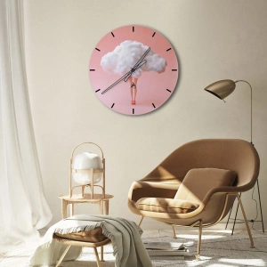 - Eine Wanduhr mit einem surrealen Motiv: Frauenbeine in roten Stilettos und eine Wolke anstelle ihres Kopfes. Der rosa Hintergrund unterstreicht die Modernität und den künstlerischen Charakter der Komposition.