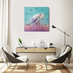 Blume, Weiß, Lila, Pastell, Rosa – diese subtilen Farbtöne ergeben eine erstaunliche Komposition, in der die Blume in die fließenden Farben des Wassers eintaucht. Die 30 x 30 cm große Glasuhr zieht mit ihren eleganten Tönen die Blicke auf sich.