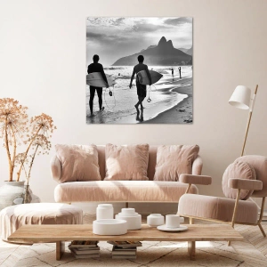 Bild auf Leinwand - Leinwandbild - Zwei Surfer laufen mit ihren schwarz-weißen Brettern am Strand entlang. - 70x50cm - Single-Wave-Samba - Moderne Wanddekoration für Wohnzimmer und Schlafzimmer ARTTOR