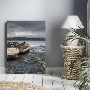 Bild auf Leinwand - Leinwandbild - Verlassene Boote am Ufer in einer regnerischen Szene - 70x50cm - „Als Zeichen würdevoller Härten“ - Moderne Wanddekoration für Wohnzimmer und Schlafzimmer ARTTOR