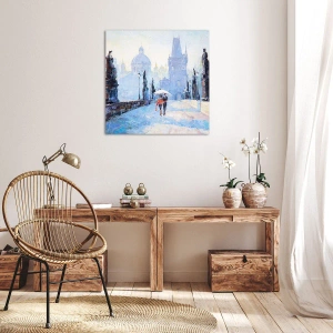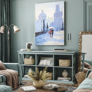 Bild auf Leinwand - Leinwandbild - Romantisches Paar auf einer Brücke im Regen, eine malerische Szene - 50x70cm - Der Regen muss uns verzaubert haben - Moderne Wanddekoration für Wohnzimmer und Schlafzimmer ARTTOR