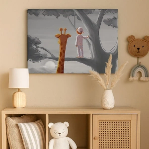 Die Leinwand wird über den Rahmen gespannt. Die Seiten und Kanten werden gedruckt, um das Bild fortzusetzen. Das Bild ist fertig zum Aufhängen an der Wand. Jedes Produkt hat einen am Rahmen befestigten Anhänger und ein Montageset (Schraube + Stift).