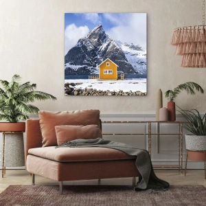 „Skandinavische Feiertage“ ist ein 70 x 50 cm großer Leinwanddruck im Querformat, der die Schönheit einer Winterlandschaft einfängt. Es zeigt ein gelbes Häuschen vor der Kulisse schneebedeckter Berge und eines ruhigen Meeres und schafft so eine einzigartige Komposition voller Kontraste und Harmonie.