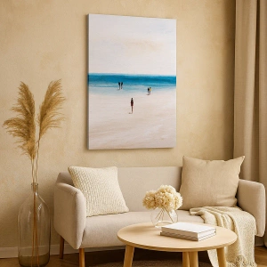 Das Leinwandbild „Natural Need“ zeigt eine malerische Strandlandschaft mit Menschen, die im Sand spazieren gehen, vor dem Hintergrund des ruhigen Meeres. Die Komposition zeichnet sich durch dezente Farben aus, wobei die Türkis- und Blautöne des Wassers dominieren und einen sanften Kontrast zu den hellen Farben des Sandes bilden. Das Ganze schafft eine harmonische und entspannende Szene, die eine Atmosphäre von Urlaubsruhe in Ihr Zuhause bringt.