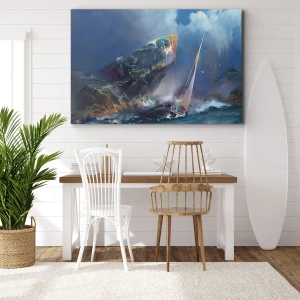 Wandbild – Wer wagt, gewinnt – Ein Segelboot im Sturm am Fuße eines mächtigen Felsens