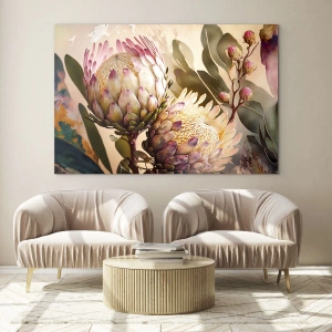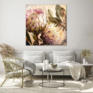 Die künstlerische Ausführung des Gemäldes begeistert mit seinen Details – Schichten von Blütenblättern, Struktur der Blätter, realistisches Hell-Dunkel. All dies lässt die Szene fast dreidimensional erscheinen. Die Farbkomposition basierend auf Rosa-, Grün-, Cremeweiß- und Bernsteintönen schafft ein harmonisches Ganzes, das die Sinne beruhigt. Die Protea wurde in verschiedenen Blütephasen eingefangen, was dem Bild Dynamik und Tiefe verleiht.