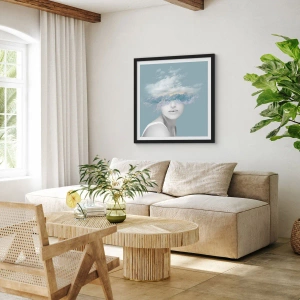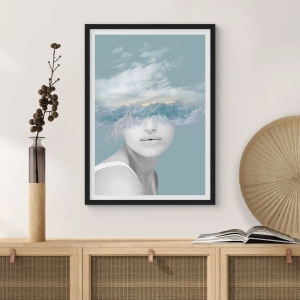 Poster in einem schwarzem Rahmen - Porträt einer Frau, deren Gesicht hinter Wolken und Wellen verborgen ist - 70x50cm - Mit dem Kopf in den Wolken - Moderne Wanddekoration für Wohnzimmer und Schlafzimmer ARTTOR