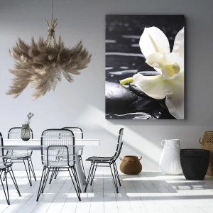 Eine weiße Orchidee vor einem Hintergrund aus schwarzen Steinen und Wasser ist eine perfekte Dekorationsoption für moderne und elegante Innenräume. Dieser Leinwanddruck schafft eine Atmosphäre der Ruhe und Harmonie und verleiht jedem Raum einen Hauch von einzigartigem Stil und Klasse.