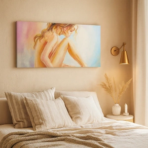 Bild auf Leinwand - Leinwandbild - Eine zarte Figur einer Frau auf einem pastellfarbenen Hintergrund - 70x50cm - Akt der Jugend - Moderne Wanddekoration für Wohnzimmer und Schlafzimmer ARTTOR