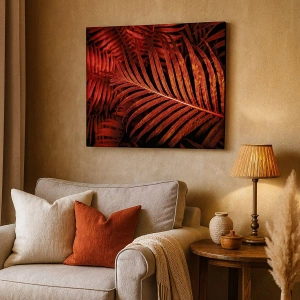 „Lebenswärme“ ist ein einzigartiges Gemälde auf Leinwand im Querformat 70 x 50 cm, das eine Nahaufnahme tropischer Blätter in intensiven Rottönen zeigt. Die Komposition strahlt exotische Schönheit und Eleganz aus und verleiht dem Interieur eine einzigartige Atmosphäre. Zarte Details und tiefe Farben machen dieses Gemälde zu einem einzigartigen dekorativen Akzent.