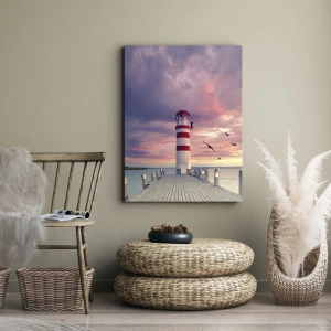 Zeit, zum Hafen zu gehen ist ein Leinwandgemälde, das den Betrachter in die malerische Szenerie eines Sonnenuntergangs am Meer entführt. Der Leuchtturm am Ende eines Holzpiers schafft eine friedliche und romantische Atmosphäre, in der sich Natur mit subtiler Eleganz verbindet. Das Gemälde begeistert mit seiner Farbharmonie und seinem künstlerischen Ausdruck und bringt Ruhe und Inspiration in den Innenraum.