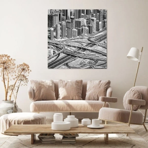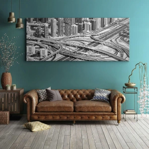 Auf der 70 x 50 cm großen Leinwand, die mit viel Liebe zum Detail gefertigt wurde, können Sie die Komplexität der Stadtlandschaft voll und ganz würdigen. Die Bilddetails heben die dynamischen Linien der Straßen und die beeindruckende Architektur der Wolkenkratzer hervor und verleihen dem Raum Tiefe und Charakter.
