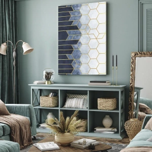 Die Leinwand wird über den Rahmen gespannt. Die Seiten und Kanten werden gedruckt, um das Bild fortzusetzen. Das Bild ist fertig zum Aufhängen an der Wand. Jedes Produkt hat einen am Rahmen befestigten Anhänger und ein Montageset (Schraube + Stift).