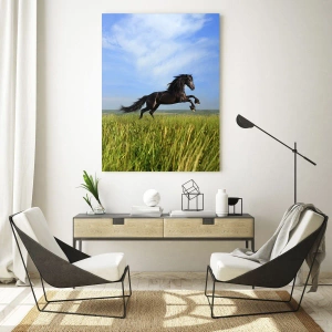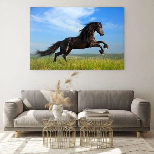 • Ein schwarzes Pferd galoppiert vor blauem Himmel und grüner Wiese. Dieses 70x50cm große Glasgemälde ist perfekt für Naturliebhaber und Liebhaber eleganter Inneneinrichtung.