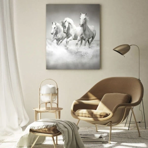 Wandbild – Weißer Wahnsinn – Drei weiße Pferde galoppieren auf dem Wasser