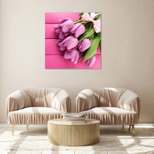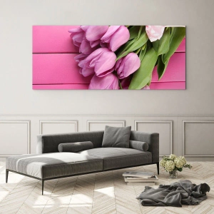 Glasbild - Bild auf glas - Ein Strauß rosa Tulpen auf einem hölzernen Hintergrund - 50x70cm - Nur für dich - Moderne Wanddekoration für Wohnzimmer und Schlafzimmer ARTTOR