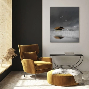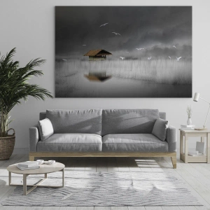 Glasbild - Bild auf glas - Ein Haus auf dem Wasser im Nebel mit fliegenden Vögeln - 70x50cm - Schutz vor Regen - Moderne Wanddekoration für Wohnzimmer und Schlafzimmer ARTTOR