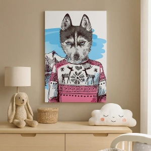 • Dieses Gemälde zeigt einen Wolf in einem Winterpullover vor einer malerischen Berglandschaft. Eine humorvolle und stilvolle Komposition, die jedes Interieur perfekt ergänzt.