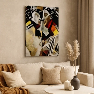 • Verliebtes Paar, Kubismus, Kuss, Menschen, Kunst, Für das Büro, für das Arbeitszimmer, für das Esszimmer, für den Flur, für das Wohnzimmer, für das Schlafzimmer, Schwarz, Orange, Grau, Gelb, Vertikal