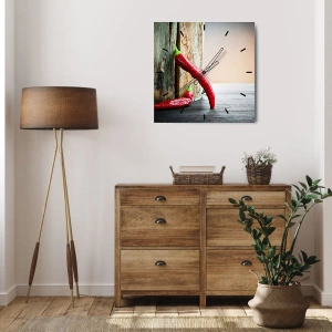 Wanduhr - Glasuhr - Rote Chilischoten auf einem hölzernen Hintergrund - 30x30cm - Red hot chili peppers - Moderne Wanddekoration für Wohnzimmer, Küche und Schlafzimmer ARTTOR