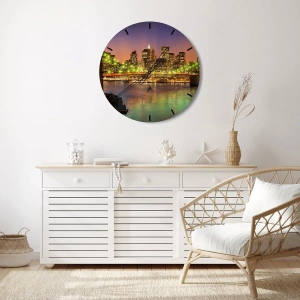 - Diese Wanduhr zeigt eine beleuchtete Stadt, eine Brücke und einen Fluss im Abendlicht. Perfekt für Liebhaber des modernen Stils und der großstädtischen Atmosphäre.