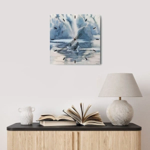 Die Uhr besteht aus 4 mm dickem Sicherheitsglas Glas. Die Herstellungstechnologie der Uhr entspricht der Sicherheitsklasse 2B2 gemäß der Norm PN-EN 12600: 2004, die Stoßfestigkeit garantiert. Die Uhr auf dem Glas ist bereit zu hängen - es hat einen Metallanhänger, einen Anhänger auf der Rückseite der Uhr und einen Schaumstoffabstand, der einen gleichmäßigen Abstand zwischen der Uhr und der Wand reguliert. Die Uhr hat einen geräuschlosen Schwimmmechanismus, der von einer 1,5-V-Batterie betrieben wird - AA-Batterie inbegriffen).