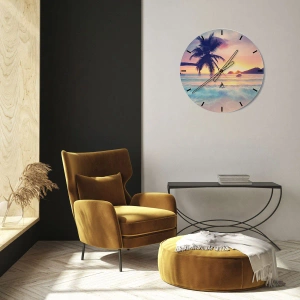 • Diese Wanduhr besteht aus robustem Glas mit rundem Zifferblatt und ist mit einer tropischen Strandlandschaft mit einer Palme bei Sonnenuntergang verziert. Perfekt für Innenräume, die eine exotische und entspannende Atmosphäre schaffen.