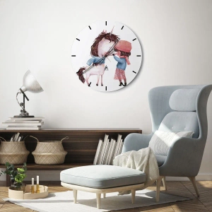 Die Wanduhr Wintermärchen ist ein zauberhaftes Märchen, das ein Mädchen zeigt, das vor winterlicher Kulisse ein Einhorn küsst. Beide sind mit Schals und warmer Kleidung bekleidet, was die Stimmung der Nähe und Zärtlichkeit in der Winterlandschaft verstärkt. Es ist eine zarte Szene, die den Betrachter in eine Welt der Fantasie, kindlicher Emotionen und unbeschwerter Momente voller Liebe und Träume entführt.