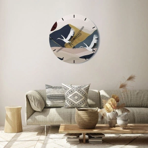 - Diese kunstvolle Wanduhr im Format 30 x 30 cm zeigt ein Motiv mit Kranichen, die über abstrakte Berge fliegen, und einer roten Sonne. Die runde Glasuhr passt perfekt in orientalische, minimalistische und moderne Innenräume.