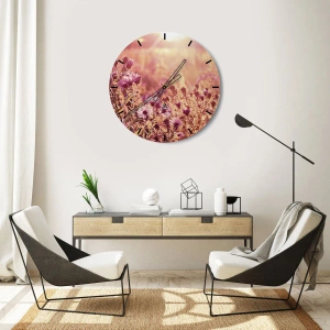 - Eine runde Uhr auf Glas im Format 30 x 30 cm mit einer Aufnahme von lila Blumen auf einem Feld bei Sonnenuntergang, in einer warmen, romantischen Atmosphäre der Natur.