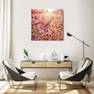 Wanduhr - Glasuhr - Lila Blumen auf einem Feld bei Sonnenuntergang in warmem Licht - 30x30cm - Bevor der Sommer vorbei ist - Moderne Wanddekoration für Wohnzimmer, Küche und Schlafzimmer ARTTOR